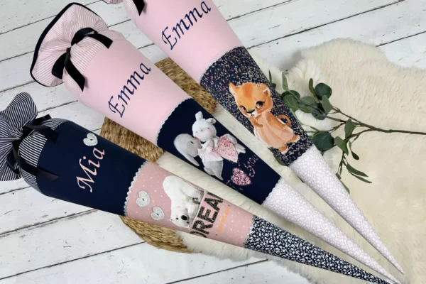 Zum ersten Schultag darf eine wunderschöne Zuckertüte nicht fehlen. Unsere handmade Schultüten werden in liebevoller Handarbeit gefertigt und mit traumhaft schönen Stoffen nach deinen wünschen genäht. Egal ob es eine verspielte, kitschige oder eine schlichte Schultüte sein soll, sie wird an dem ersten Einschulungstag für dein Kind etwas unvergessliches sein. Gerne verzieren wir deine Tüte mit einem Motiv, Namen, Datum oder selbst gehäkelten Motiven.